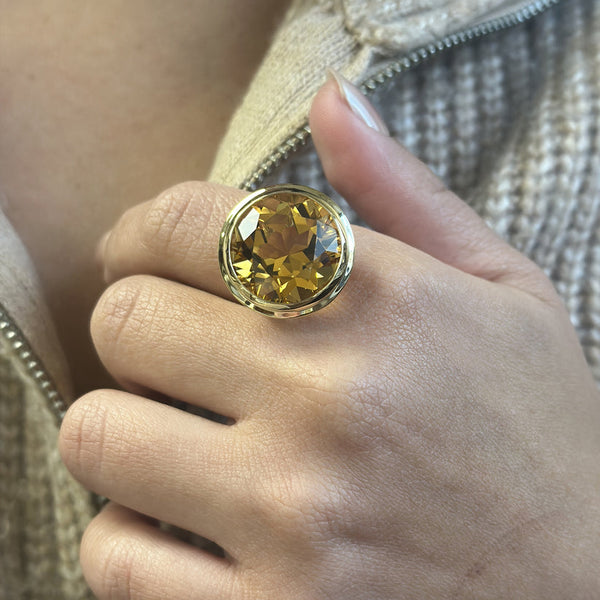 From Goshwara’s Manhattan Collection, the Round Cocktail Ring is a bold yet graceful statement of sculptural elegance. Featuring a richly faceted 20–25 carat citrine, bezel-set in luminous 18K yellow gold, the seamless design balances striking volume with refined craftsmanship. The clean lines and golden glow make this piece equally stunning as a cocktail centerpiece or a treasured addition to your fine jewelry collection.