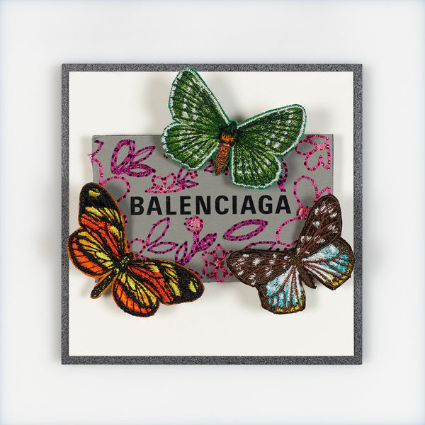 Embroidery stitched directly through a luxury box. Corners adorned with tapestry-style embroidery. Embroidered butterflies mounted in relief.