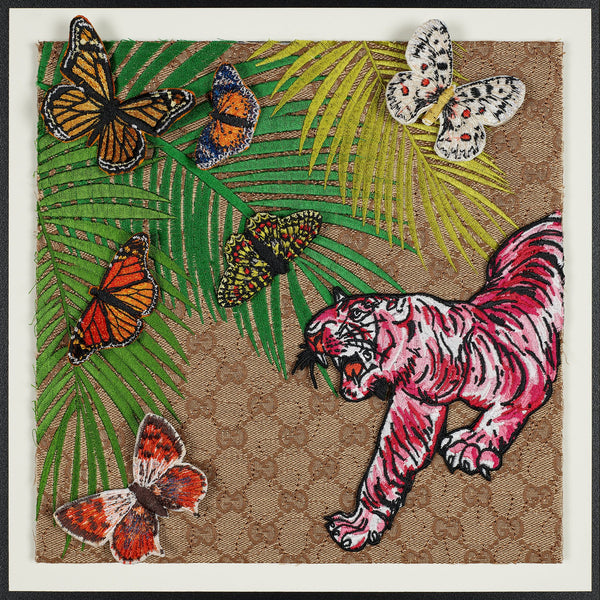 Embroidery stitched directly through a luxury box. Corners adorned with tapestry-style embroidery. Embroidered butterflies mounted in relief.