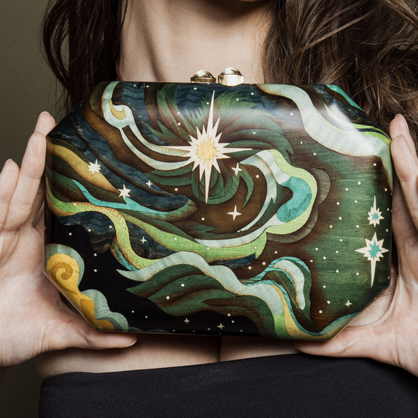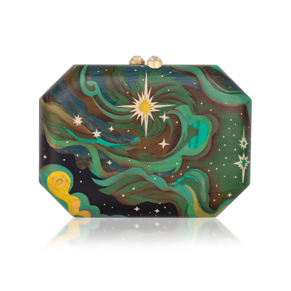 A story in your palm — this Silvia Furmanovich clutch is a sculptural marvel of marquetry and meaning. Featuring a green Elphada sky print set against prasiolite in an octagonal silhouette, every curve whispers elegance. Framed in 18k yellow gold and centered by a luminous 11.52ct prasiolite, this clutch carries a message as powerful as its beauty: Supports Dream of Hope.