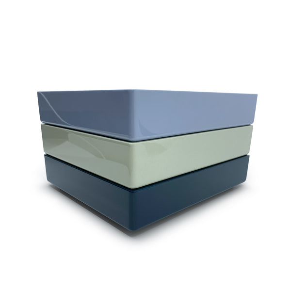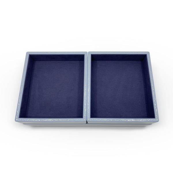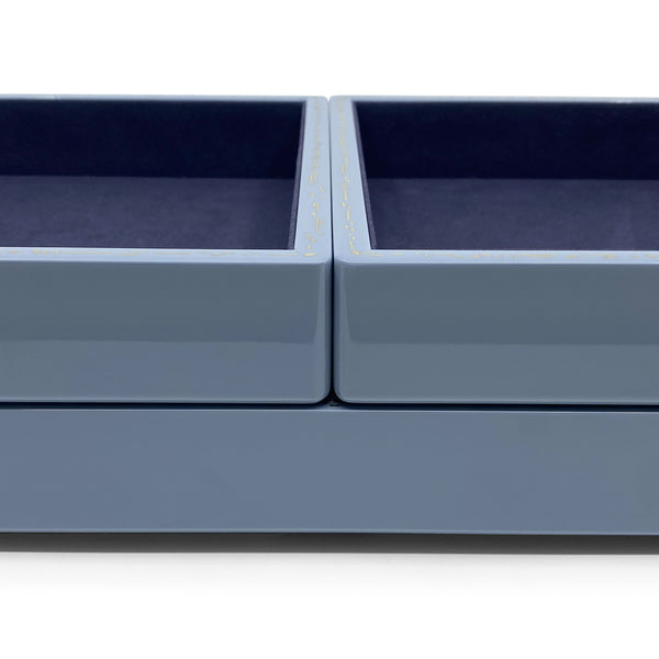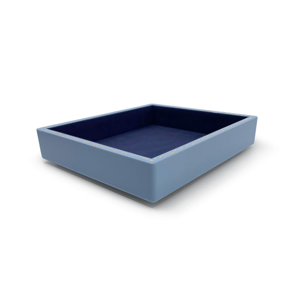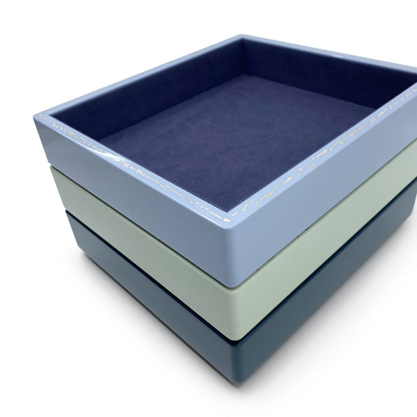 The Trove Small Jewelry Tray in Evening Blue is a sophisticated open storage solution for jewels, watches, and keepsakes. Crafted from wood with a high lacquer finish, plush faux suede lining, and delicate gold effect inlay, it’s as beautiful as it is functional. Designed to stack seamlessly with Trove’s small jewelry tray, it lets you mix and match colors and sizes for a custom, elevated look.