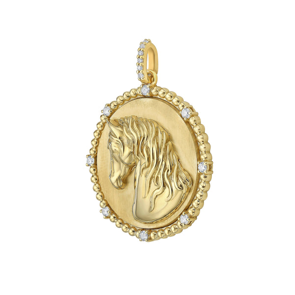 The Legacy Horse Diamond Bead Medallion from Lionheart is a powerful symbol of strength, freedom, and enduring spirit, rendered in sculpted yellow gold with striking depth and detail. Framed by a halo of diamond bead accents and finished with a diamond-set bail, this medallion feels timeless and commanding, designed to be worn as a modern heirloom.