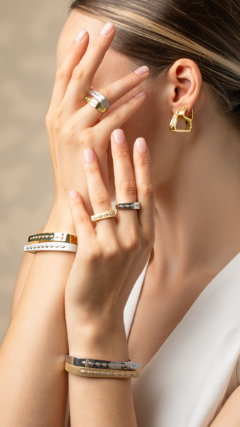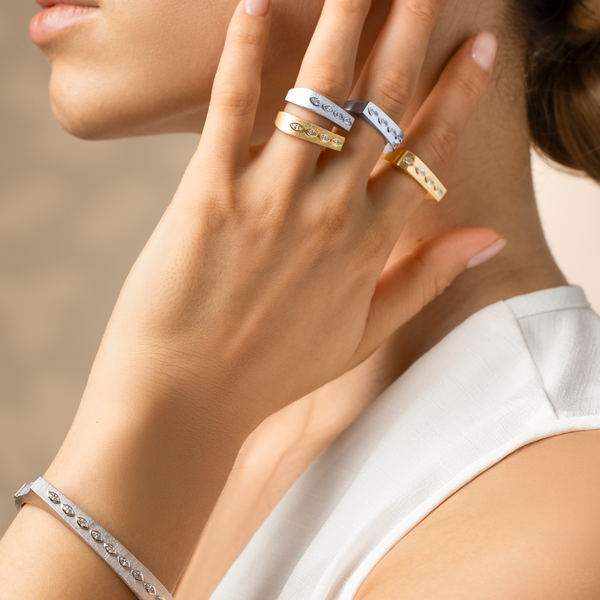 Minimal yet refined, this Maison H Jewels ring offers a modern take on timeless elegance. Crafted in brushed 18k yellow gold, its sleek tapered silhouette is set with four marquise-cut white diamonds in a delicate vertical row. The soft matte finish contrasts beautifully with the sparkle of the stones, creating a piece that’s both sculptural and sophisticated. Wear it solo for subtle impact or stack it for elevated edge.