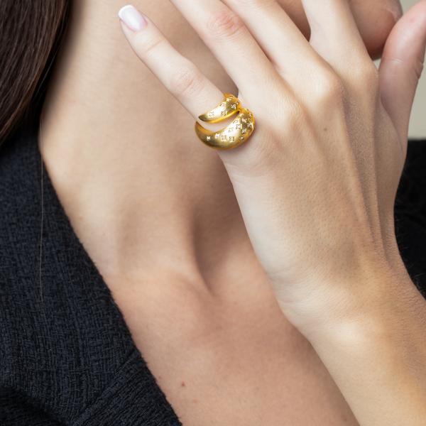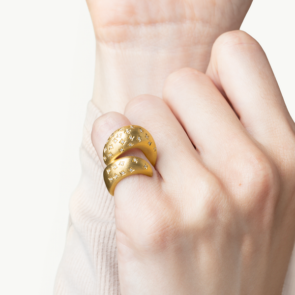 Boldly sculptural with a celestial touch, this Maison H Jewels ring makes a radiant statement. Handcrafted in 18k yellow gold with a rich brushed finish, its signature swirling silhouette is adorned with delicate star-set white diamonds that appear to dance across the surface. The soft matte texture contrasts beautifully with the warm gold and sparkling stones, creating a piece that feels both powerful and poetic.