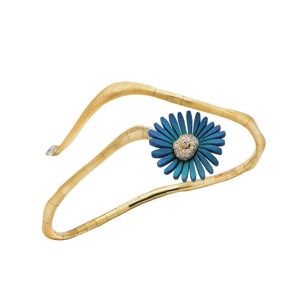 The Petali Blue Titanium Flower Bangle by Mike Joseph wraps the wrist in a sculptural curve of 18K yellow gold, anchored by a vivid titanium bloom that feels both modern and ethereal. White diamonds add a soft flash of light, transforming this sleek bangle into a piece that moves with quiet drama and expressive elegance.