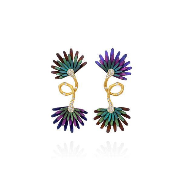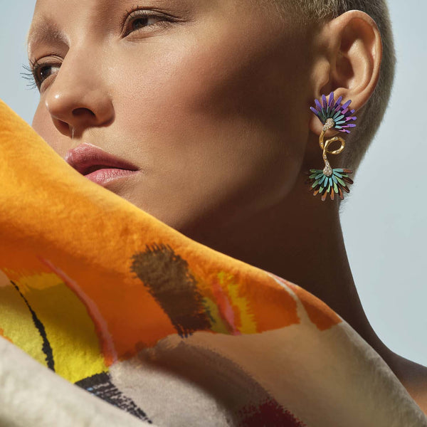 The Petali Triple-Floor Titanium Earrings by Mike Joseph bloom in cascading layers of vibrant, ultra-light petals that radiate from sculptural 18K yellow gold stems. Each earring unfolds with bold movement and mesmerizing color, illuminated by white diamonds that shimmer with every turn of the head.