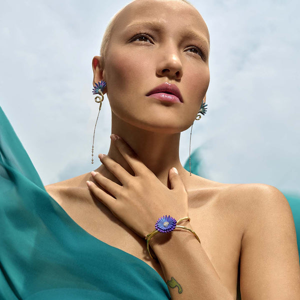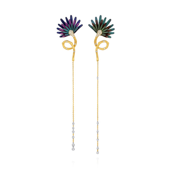 The Petali Half-Flower Titanium Earrings by Mike Joseph bloom in two vibrant color stories, each crafted with ultra-light titanium petals that radiate with sculptural intensity. Suspended from fluid 18K yellow gold forms and finished with cascading diamonds, they create a look that feels airy, modern, and effortlessly expressive.