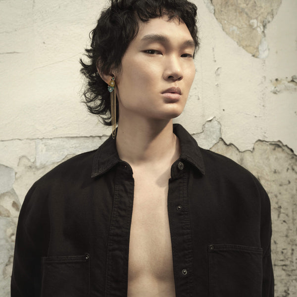 The Petali Beaded Chain Drop Earrings by Mike Joseph pair delicate titanium blooms with cascading strands of 18K yellow gold, accented with natural beads for an added layer of texture and color. White diamonds bring a soft sparkle to the flowers, giving this silhouette an airy elegance that feels both artistic and effortlessly chic.