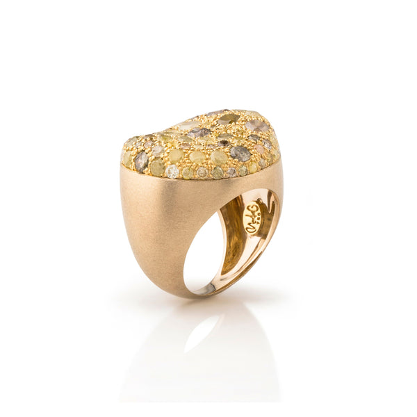 The Malak Icy Round Ring embodies sculptural strength and rare beauty. Crafted in 18K yellow gold and set with 5 carats of icy diamonds, its bold dome silhouette shimmers with natural brilliance. Both powerful and poetic, this ring is a modern heirloom designed to be treasured across generations.