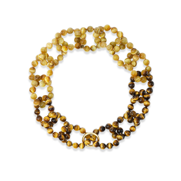 Anna Maccieri Rossi’s Night and Day Necklace features rich tiger’s eye beaded links paired with sculptural 18K yellow gold for a bold yet refined statement. Finished with a jumbo openable clasp, this piece is designed for effortless layering, charm styling, and everyday luxury wear.