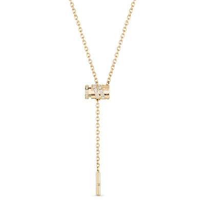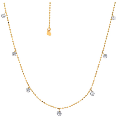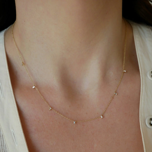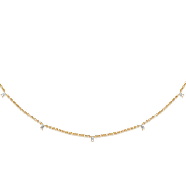 The 7 Baguette Diamond Necklace gleams with small diamonds set along a delicate cable chain. Designed to twinkle on your neck, this dainty necklace looks great layered or solo.