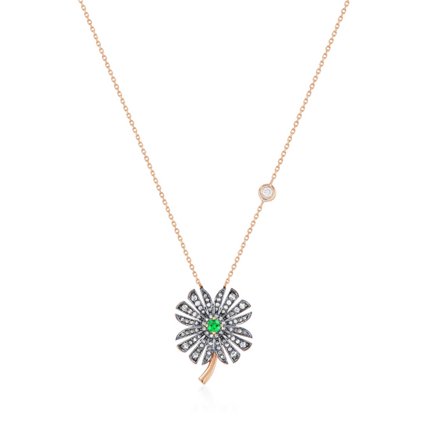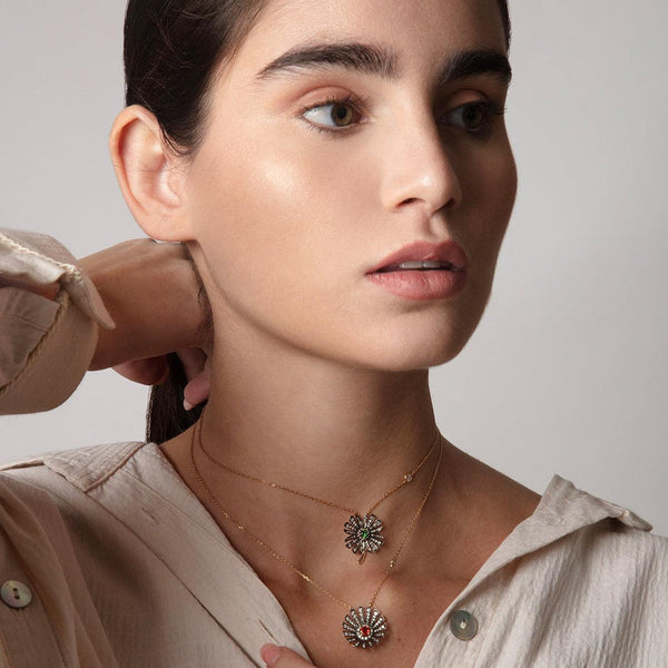 Joanna Dahdah’s Clover Necklace is a symbol of luck and beauty, crafted in 18K gold with a vivid 0.11ct tsavorite at its center and accented by 0.05ct white diamonds and 0.34ct brown diamonds. Hand-set petals radiate brilliance, giving the clover motif a modern edge while preserving its timeless charm. A meaningful jewel that elevates everyday wear into a celebration of elegance and fortune.
