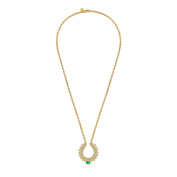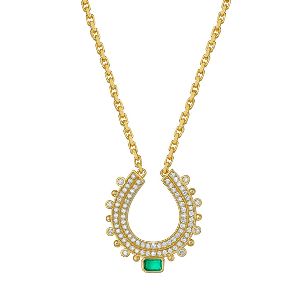 The Lionheart Lucky Emerald and Diamond Horseshoe Necklace is a radiant emblem of fortune and elegance. Handcrafted in 14K yellow gold, the horseshoe pendant is illuminated with 1.00 carat of brilliant diamonds and crowned with a vibrant 0.20 carat emerald drop — a symbol of prosperity, protection, and the power of possibility. Suspended from an 18-inch cable link chain, it’s the perfect everyday talisman.