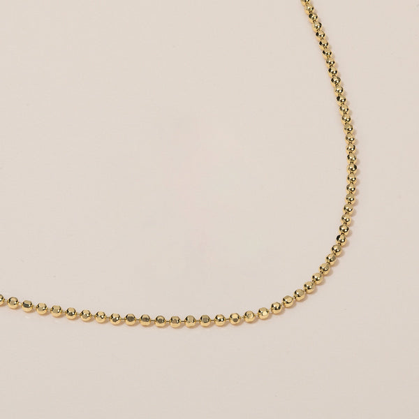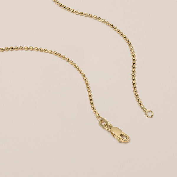 Our Majesty Ball Chain is made of extra-sparkly spheres that have been faceted with a special diamond tool to give it a special shimmering appearance. We love wearing this 14k gold chain both all on its own and layered with different chains!