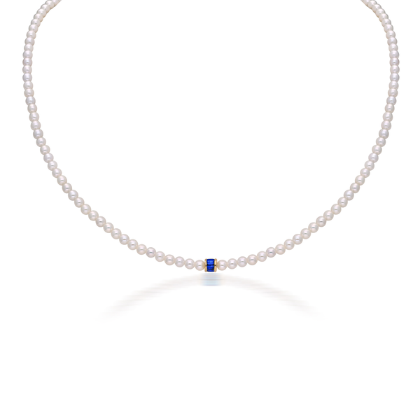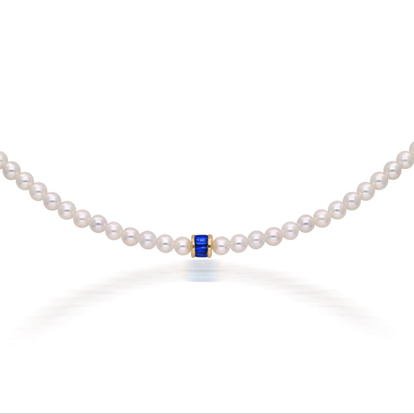 The Moksh Kyoto Blue Sapphire and Pearl Necklace captures the purity of water and the clarity of sky in one serene strand. Hand-knotted freshwater pearls create a gentle rhythm of light, ending in a singular blue sapphire baguette that offers a moment of focus and tranquility. This minimalist yet deeply intentional design channels inner peace, balance, and spiritual clarity.
