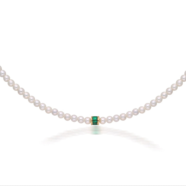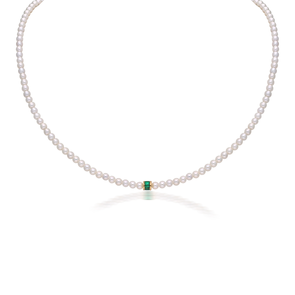 The Moksh Kyoto Emerald and Pearl Necklace is an ode to renewal and spiritual clarity. A continuous strand of freshwater pearls is anchored by a single emerald baguette—symbolic of new beginnings and heart-centered energy. Refined, contemplative, and timeless, this design brings together the purity of pearls and the grounding power of emerald.