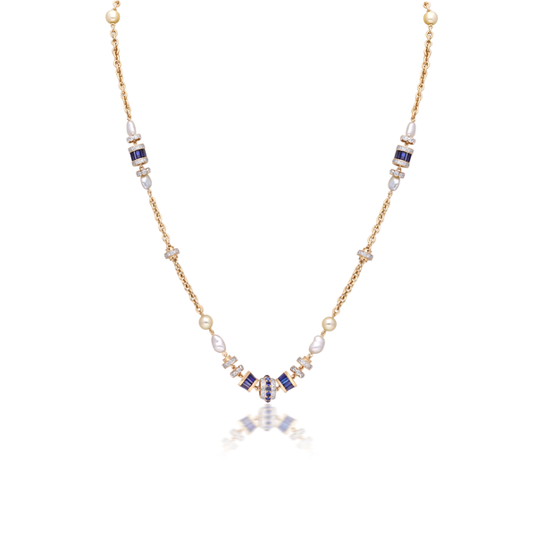 The Moksh Paro Blue Sapphire Necklace channels regal strength and timeless grace. Crafted in 18K yellow gold, this necklace features hand-set baguette blue sapphires framed by freshwater and keshi pearls. The design evokes the majesty of royal Indian palaces, offering a balance of structure and soul.