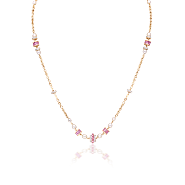 The Moksh Paro Pink Sapphire Necklace is an ode to divine femininity. Handcrafted in 18K yellow gold, it showcases luminous freshwater pearls and keshi pearls contrasted with radiant pink sapphires and diamonds. Inspired by celestial geometry, this piece feels like sacred architecture worn at the heart.