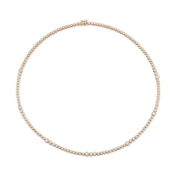 Ondyn’s Rainsun Diamond Tennis Necklace in 18K yellow gold is liquid brilliance reimagined—6.35 carats of brilliant-cut diamonds illuminating every curve of its 15-inch silhouette. Fluid and luminous, it’s a modern icon that moves like light across the skin. Powerful yet refined, this necklace is the ultimate expression of contemporary luxury.