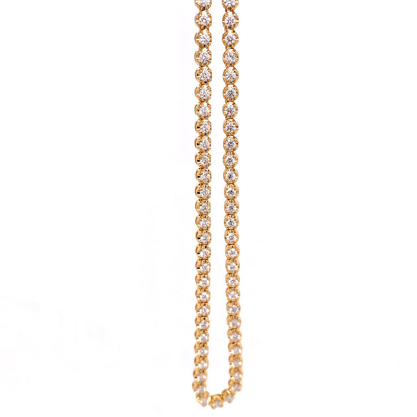 Refined brilliance meets timeless design in Ruchi’s “Scintillate” Diamond Riviera Necklace. Handcrafted in luminous 18K yellow gold, this 32-inch strand features a flawless parade of 271 round brilliant-cut diamonds, each set in a perfectly calibrated setting to create a seamless flow of sparkle. Designed to lay elegantly against the collarbone or layered with other heirloom-worthy pieces, this necklace is a modern icon of luxury and craftsmanship.