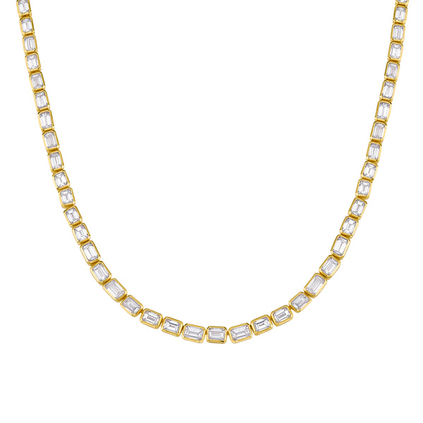 A sleek, contemporary twist on the classic diamond necklace. The “Scintillate” East-West Bezel Necklace by RUCHI showcases 100 emerald-cut diamonds set horizontally in refined bezel settings, offering structured sparkle from every angle. Handcrafted in rich 18K yellow gold, this 16-inch necklace lays elegantly along the collarbone, making it a timeless heirloom with modern clarity.