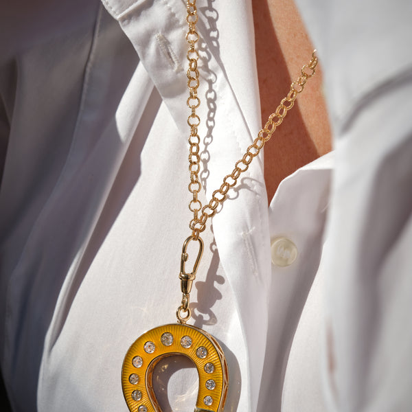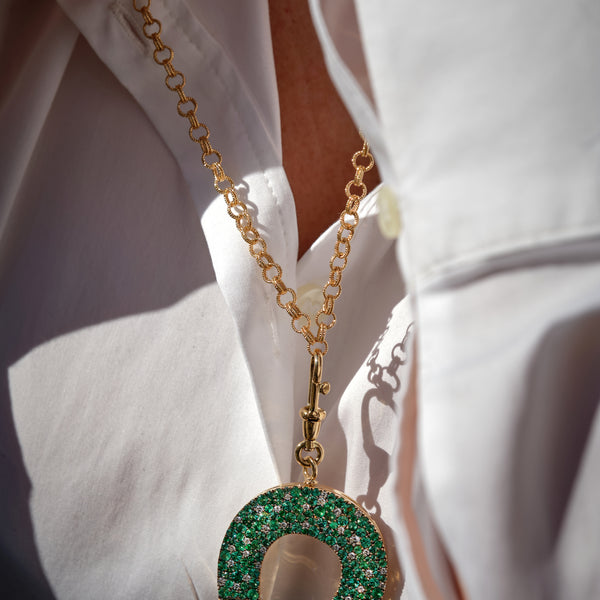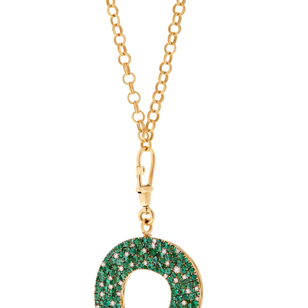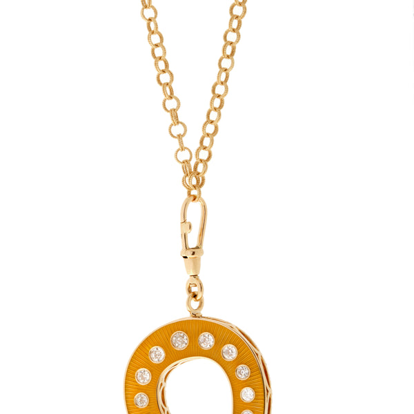 - Pendant in 18K yellow gold, yellow enamel set with diamonds and emeralds