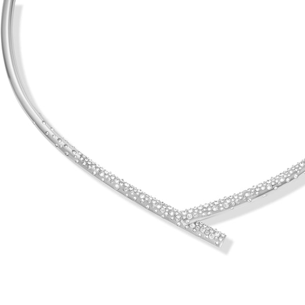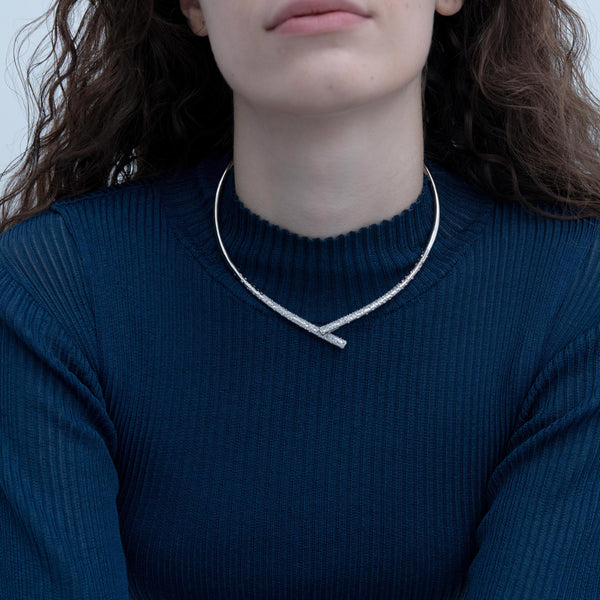 The Oera Choker by Tabayer redefines strength and simplicity through a sculptural lens. Handcrafted in Fairmined 18K white gold and illuminated with 3.91 carats of pavé-set diamonds, this statement piece embodies the purity of form and intention. Fluid yet powerful, it rests gracefully along the neckline—an emblem of balance and protection.