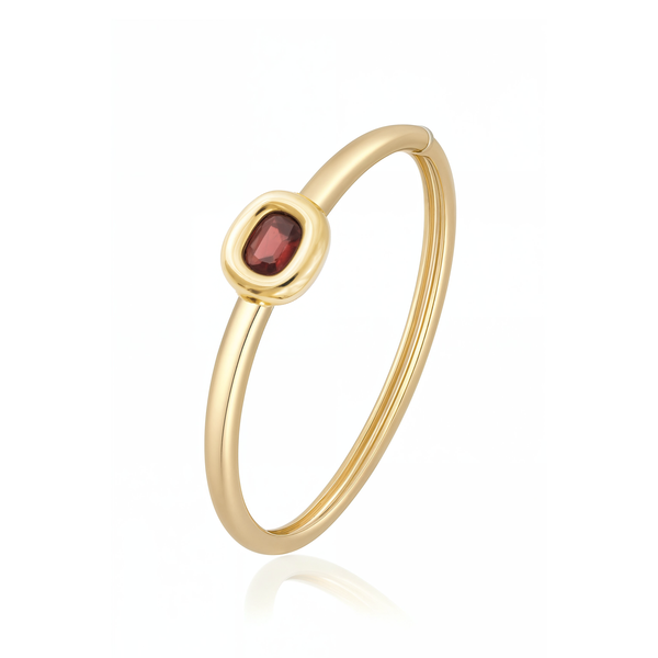 The Satine Rounded Cushion Bangle from Maison H Jewels brings a modern, sculpted elegance to the wrist with its smooth gold silhouette and vivid red tourmaline centerpiece. The design balances clean lines with a rich pop of color, creating a piece that feels refined, warm, and effortlessly wearable.