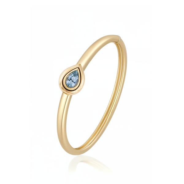The Satine Teardrop Bangle from Maison H Jewels brings a refined, minimalist silhouette to the wrist, anchored by a soft aquamarine teardrop that adds a whisper of color. Its smooth gold contour creates a clean, modern line that feels effortlessly polished for everyday wear.