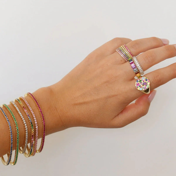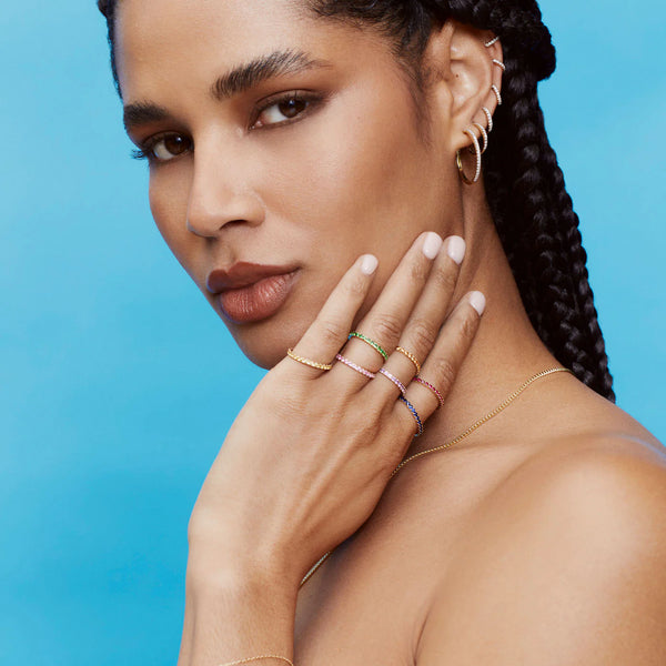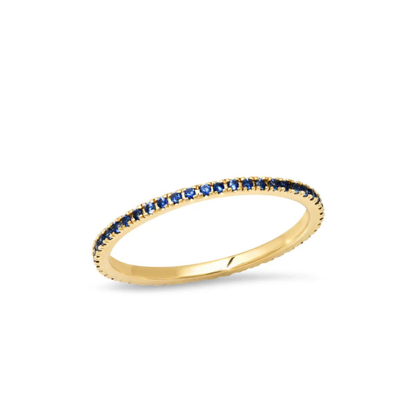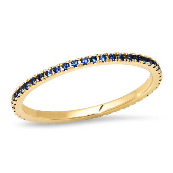 A classic stacking ring for any occasion, the 14K Gold Blue Sapphire Eternity Band is a must-have piece. Featuring a single row of beautiful round blue sapphires, wear this stunning ring on its own for a dainty feel, or stacked with others to make a statement.
