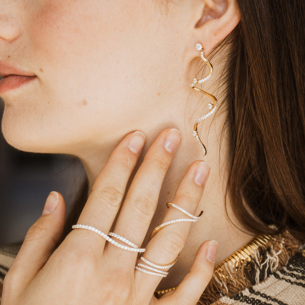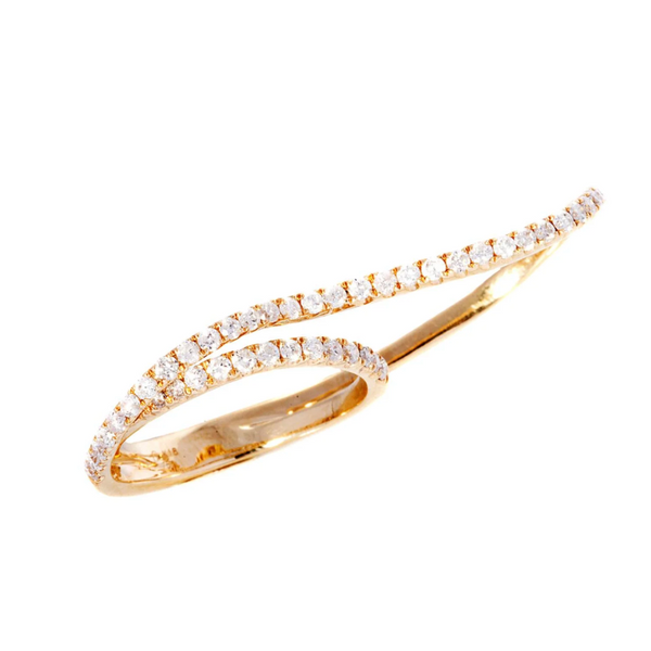 The Graziela Double Dynamite Ring in 18K yellow gold is a study in sculptural elegance and modern strength. Pavé-set with 0.85 carats of G–H color white diamonds, this sleek double-finger design curves effortlessly across the hand, capturing light with every movement. A true statement of sophistication, it blends bold architecture with timeless radiance.