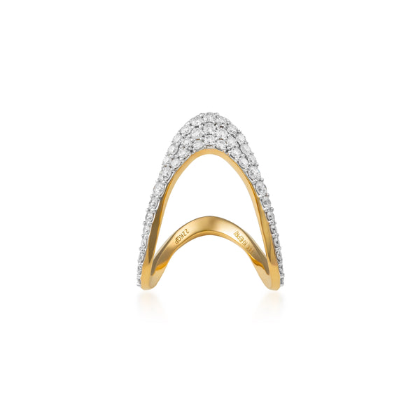 Khepri Jewels’ Diamond Pavé Vanki Ring brings timeless elegance with a modern edge. Sculpted in 18K & 22K yellow gold, its v-shaped silhouette is encrusted with approximately 1.05 carats of pavé diamonds. A versatile design that elevates every look.