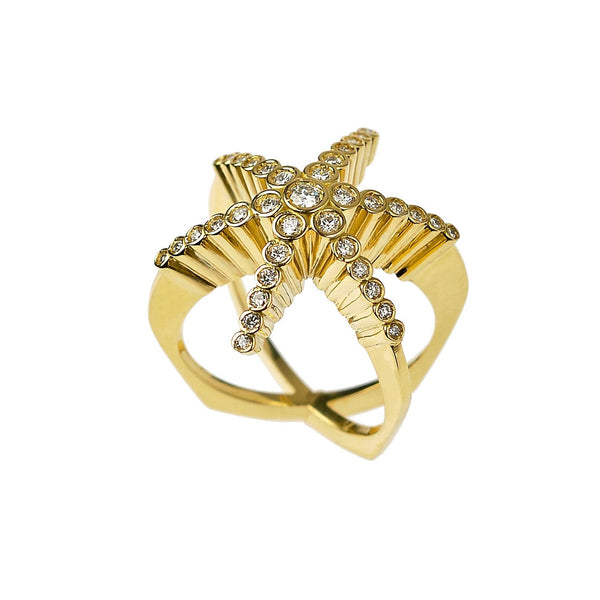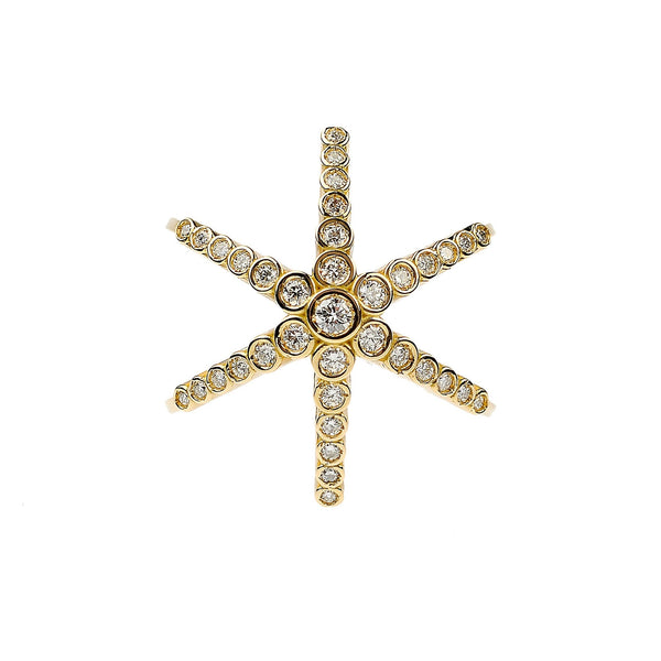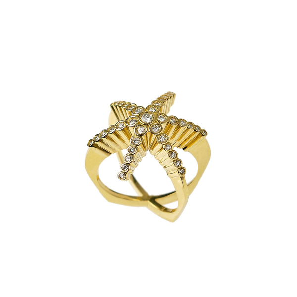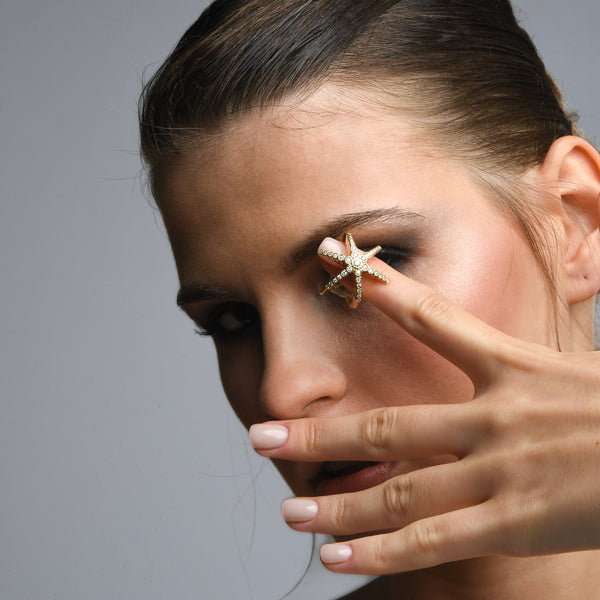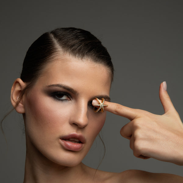 Maria Kotsoni’s Finger Hugging Star Ring captures her sculptural approach to jewelry—bold yet effortless. Crafted in lustrous 18K yellow gold and set with natural VS G+ diamonds, the piece wraps the finger like a celestial form caught mid-motion, balancing strength and serenity.