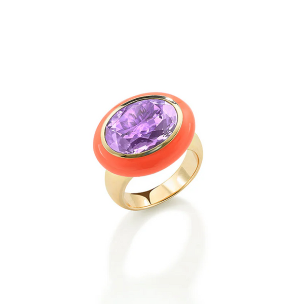 Made from 14ct yellow gold, this striking design features an arresting mid purple 7.96ct amethyst stone to the centre with an orange enamel surround that effortlessly commands attention.