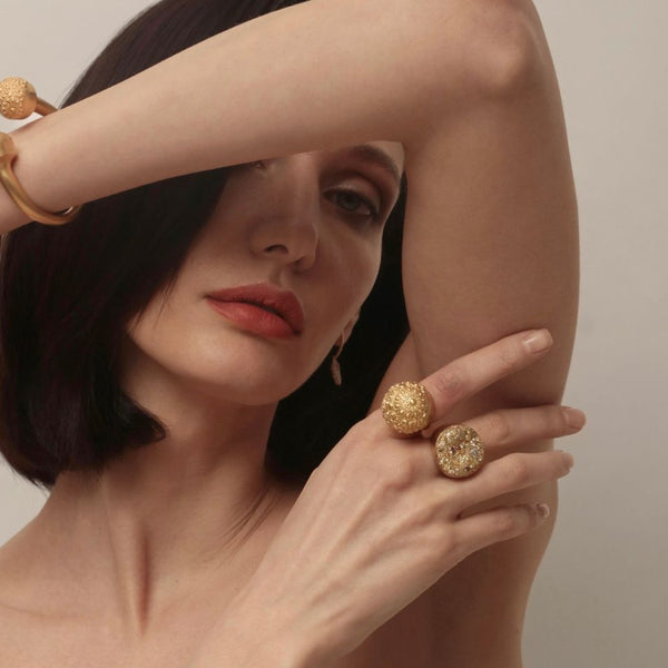 The Malak Icy Round Ring embodies sculptural strength and rare beauty. Crafted in 18K yellow gold and set with 5 carats of icy diamonds, its bold dome silhouette shimmers with natural brilliance. Both powerful and poetic, this ring is a modern heirloom designed to be treasured across generations.