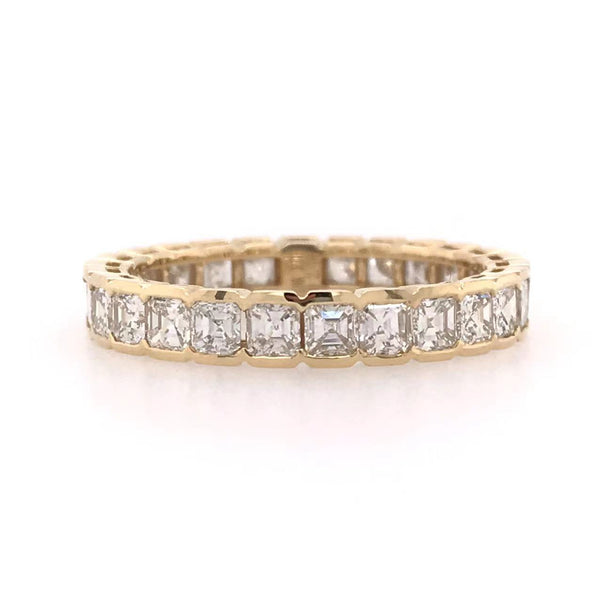 Classic elegance meets modern architecture in the “Scintilate” Asscher Eternity Ring by RUCHI New York. This radiant band features 26 Asscher-cut diamonds totaling 2.18 carats, each framed in a refined half bezel setting that offers both protection and uninterrupted sparkle.