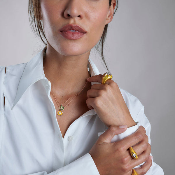 From the Aïda Collection, this Selim Mouzannar ring celebrates the vibrant glow of the Mediterranean sun. Handcrafted in 18K yellow gold, the design features a radiant layer of yellow enamel, illuminated with pavé-set white diamonds. Sculptural and symbolic, this pinky ring embodies joy, light, and bold elegance—an iconic piece that seamlessly bridges heritage and contemporary style.