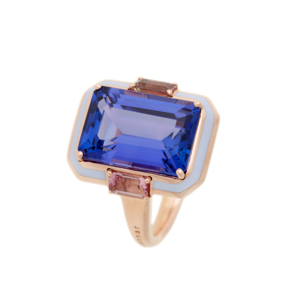 Elegant yet unexpected, this Selim Mouzannar ring features a luminous emerald-cut tanzanite center stone, set in 18K rose gold and flanked by baguette-cut Pink Tourmalines. Framed with a sleek border of white enamel, the design balances softness and structure in one refined silhouette.