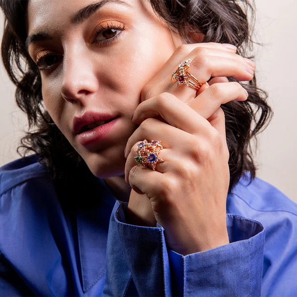 Selim Mouzannar's Istanbul collection, Al Istana, the Sublime Porte, stands as a symbol of terrestrial night, echoing the grandeur of the ancient Ottoman Empire. Above it, the celestial vault stretches, it's myriad stars reflected in the shimmering sea below. The Star, adorned with 5 or 7 branches and encrusted with precious stone, emerges as the city's ultimate talisman. A beacon for seafarers, it embodies notions of success, determination and self-assurance.