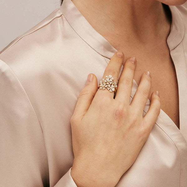 The Diamond Flower Bunch Ring captures Syna’s spirit of ethereal elegance and intricate detail. Handcrafted in 18K yellow gold, this statement ring features a radiant cluster of diamond-studded blossoms. Its sculptural design celebrates exotic inspiration and heritage craftsmanship, making it a standout piece for the modern collector.