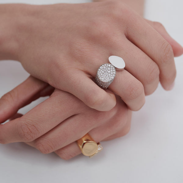 Where purity meets power. The Oera Ring by Tabayer is sculpted in 18K Fairmined gold and illuminated with pavé-set diamonds that seem to float over the surface. Its bold silhouette symbolizes protection and grounded strength—modern armor for the everyday.
