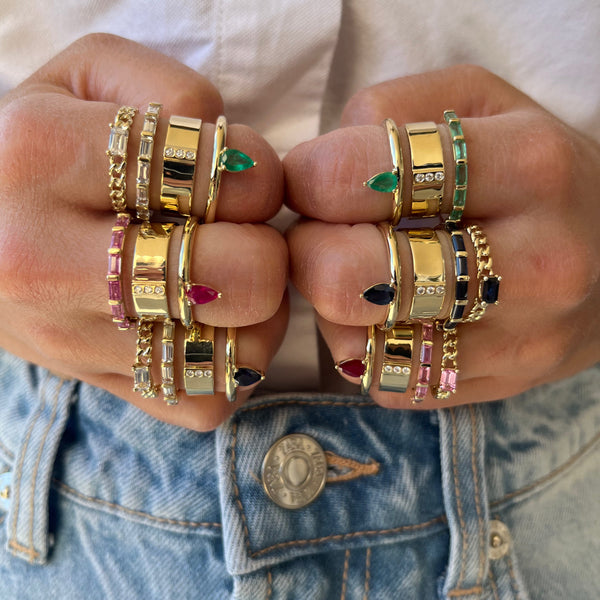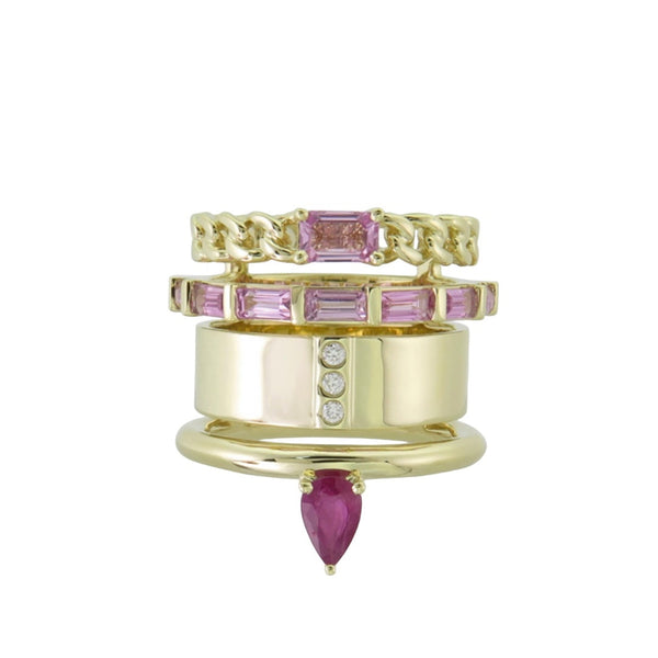 The Type Jewelry Stack Ruby Pink Sapphire Ring brings together vibrant color and sculptural form in a way that feels instantly captivating. Layers of warm gold, rich ruby, and luminous pink sapphires create a bold statement piece designed to be worn solo or built into a signature stack.