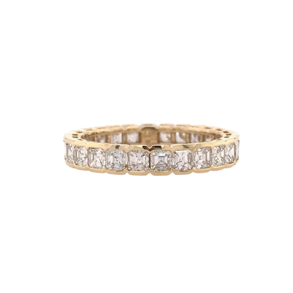 Classic elegance meets modern architecture in the “Scintilate” Asscher Eternity Ring by RUCHI New York. This radiant band features 26 Asscher-cut diamonds totaling 2.18 carats, each framed in a refined half bezel setting that offers both protection and uninterrupted sparkle.