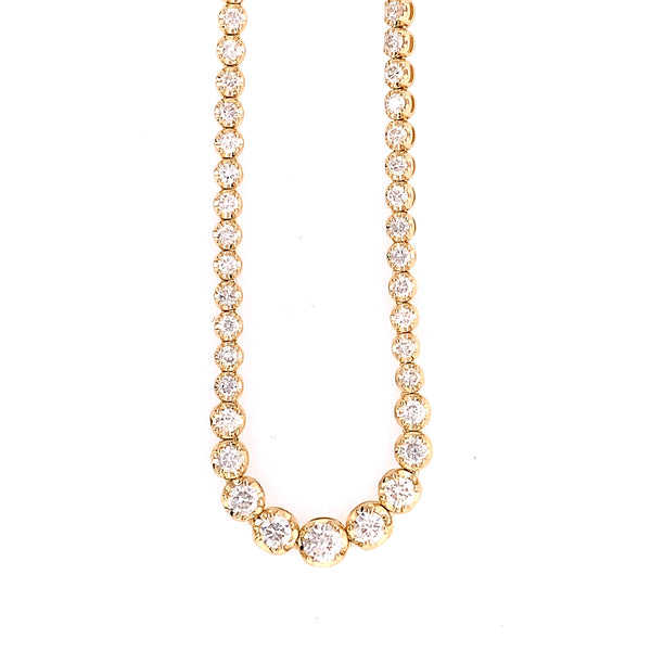 A contemporary heirloom designed to dazzle. The “Scintillate” Crown Set Riviera Necklace by Ruchi New York showcases a graduated array of round brilliant diamonds, each set in delicate crown-style bezels that maximize brilliance and create a soft, scalloped silhouette. Crafted in radiant 18K yellow gold, this 16-inch necklace sits beautifully at the collarbone—ideal for solo wear or layering with your fine jewelry favorites.