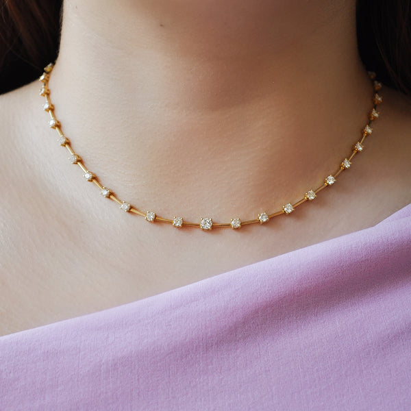 A timeless tennis necklace reimagined with architectural edge. The “Scintillate” Knife-Edge Tennis Necklace by Ruchi New York features 45 round brilliant diamonds individually prong-set along a sleek knife-edge bar design that adds structure and shimmer to every movement. Handcrafted in luminous 18K yellow gold, this 16-inch style sits perfectly at the collarbone for an effortless everyday statement.
