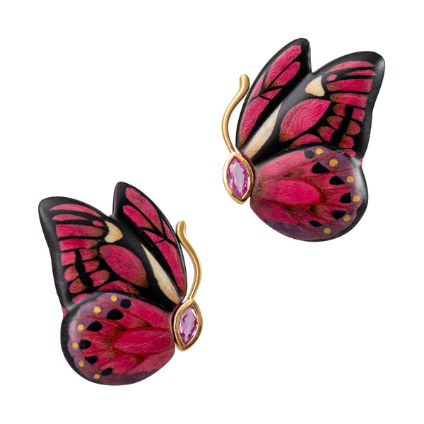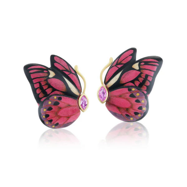A flutter of craftsmanship, a flash of brilliance. These Silvia Furmanovich earrings are not just accessories—they’re miniature works of art. Handcrafted using the ancient technique of wood marquetry, each butterfly wing is inlaid with precision and drenched in vivid pink tones. Set in rich 18k yellow gold and finished with a luminous 1.14ct pink sapphire, they strike that rare balance between whimsy and high luxury.