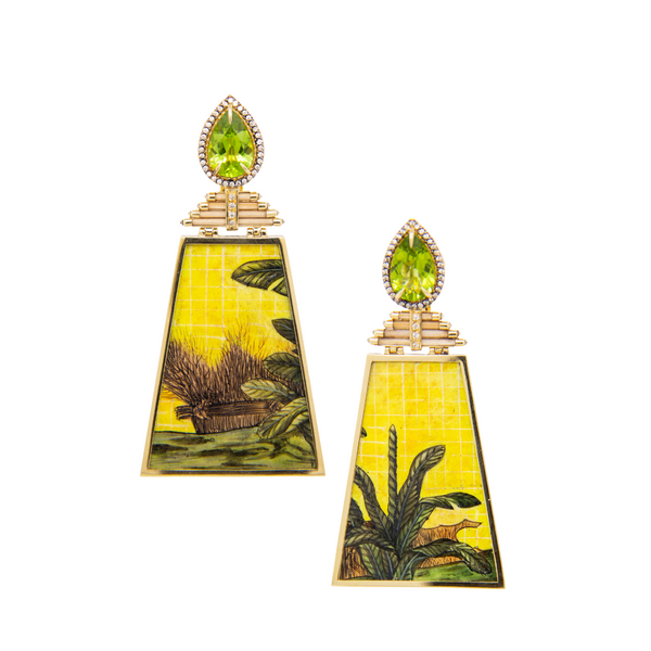 Golden light meets ancient wonder. These Silvia Furmanovich earrings bring Egypt’s lush oases to life with hand-painted bamboo landscapes. Set in bold, architectural silhouettes, each earring is crowned with a faceted peridot and a sparkle of diamonds and tsavorite. Every brushstroke and gemstone feels intentional—like an artifact reimagined in 18k yellow gold.