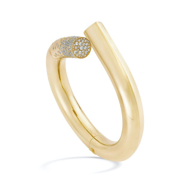Experience the bold elegance of Tabayer’s Oera Large Bracelet, crafted with Fairmined 18k yellow gold and adorned with pavé diamonds. The bracelet features a sleek push clasp for easy wear. A voluminous bangle as emboldened form, lit by a smattering of diamonds.