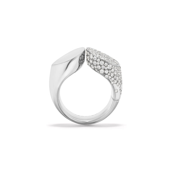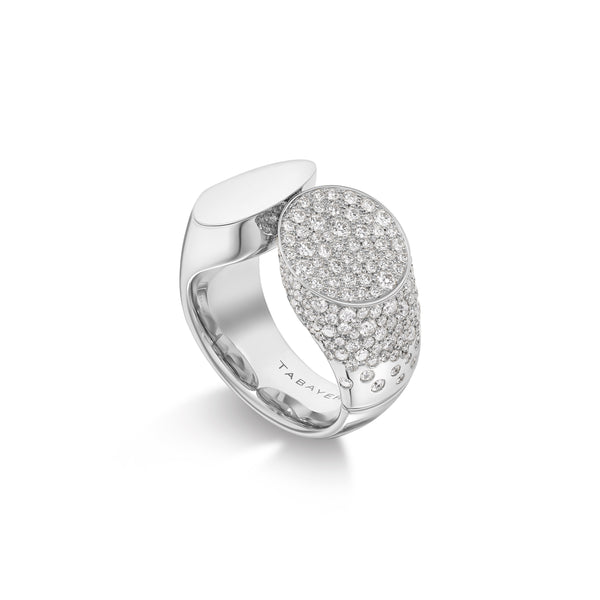 Where purity meets power. The Oera Ring by Tabayer is sculpted in 18K Fairmined gold and illuminated with pavé-set diamonds that seem to float over the surface. Its bold silhouette symbolizes protection and grounded strength—modern armor for the everyday.