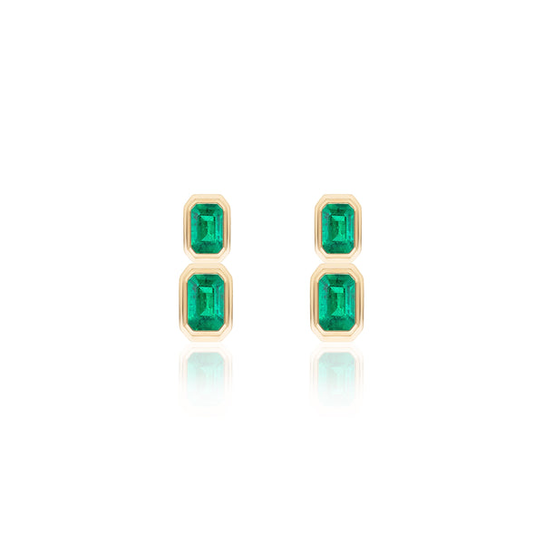 The Goshwara G-One 2 Tier Emerald Earrings capture sculptural elegance and bold color in a refined, architectural silhouette. Featuring 7.77 carats of striking emerald-cut emeralds, each tiered design is set in radiant 18K yellow gold to highlight the vibrant green hues. A statement of sophistication and strength, these earrings are designed for those who embrace timeless beauty with modern edge.